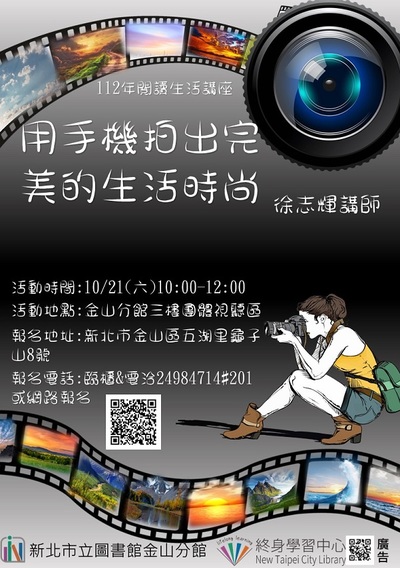 - 主題:用手機拍出完美的生活時尚 時間:10/21(六)10:00-12:00 地點:3樓團體視聽室 報名地址:新北市金山區五湖里龜子山8號 報名電話:臨櫃、電洽或網路報名(02)2498-4714#201 活動講師:徐志輝 老師