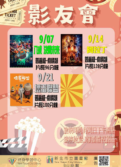 - 地點:3樓團體視聽區 日期:9/7(日)14:00 八戒 決戰未來 9/14(日)14:00 阿拉丁 9/21(日)14:00 壞蛋聯盟