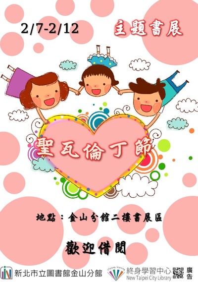 - 主題書展1:琅琅上口讀經趣 展示期間:2/1(日)-2/6(五) 展示地點:二樓書展區 主題書展2:聖瓦倫丁節 展示期間:2/7(六)-2/12(四) 展示地點:二樓書展區 主題書展3:遊山玩水 展示期間:2/13(五)-2/22(日) 展示地點:二樓書展區 主題書展4:書寫之美 展示期間:2/23(一)-2/27(五) 展示地點:二樓書展區